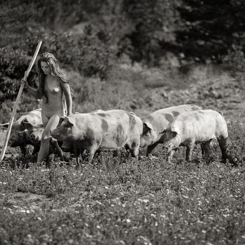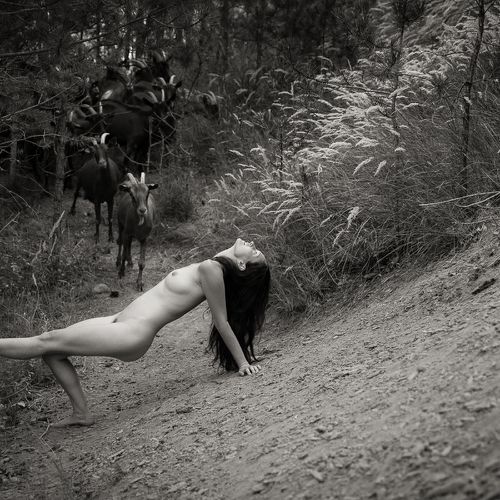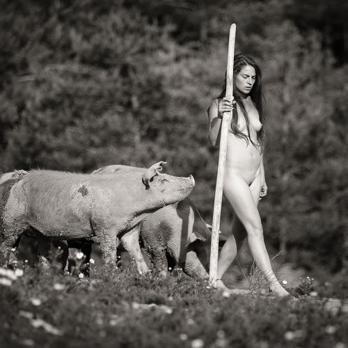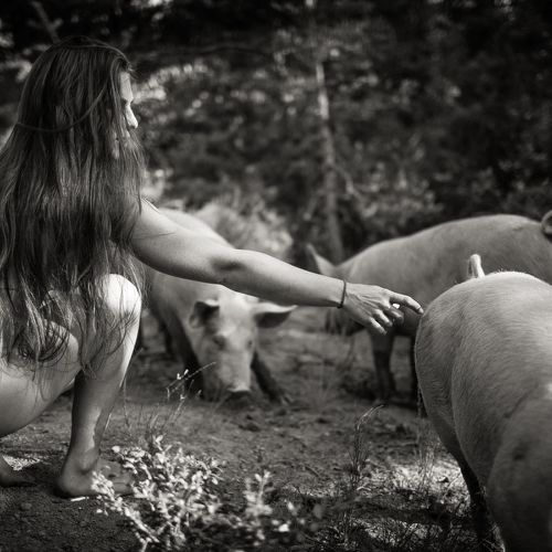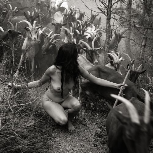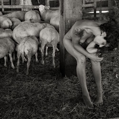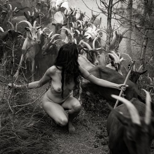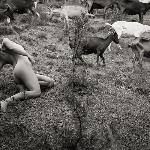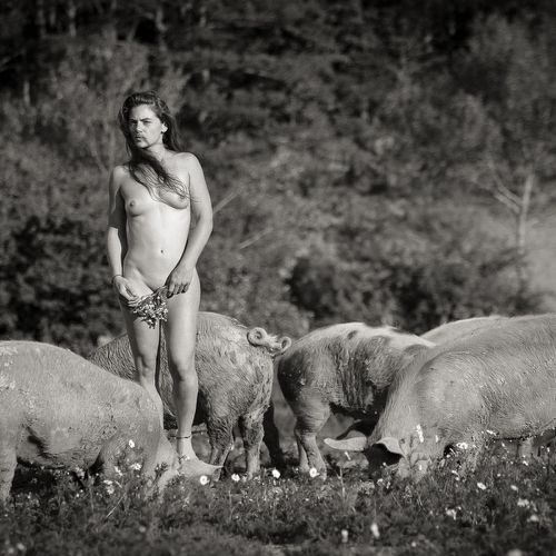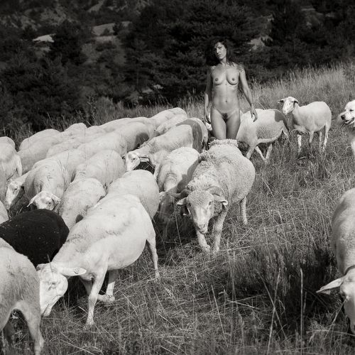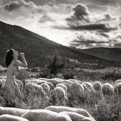 Here, the bodies are intimately linked to the elements, to the earth, air and water, but also to minerals, plants and animals. They exist in osmosis, that is to say, in reciprocity with their context. Captured in their simplest form, like their naked and hairy animals, the shepherdesses are on equal footing with their flock. What better way to feel alive and connected than through nudity? It is a very good way to reconnect with nature.